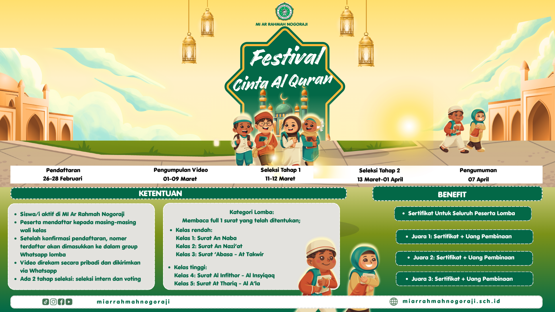 MI Ar Rahmah Nogoraji dengan bangga mempersembahkan Festival Cinta Al QUran, sebuah perayaan penuh makna dalam rangka menyambut datangnya bulan suci yang penuh berkah. Festival ini bukan sekadar seremoni, melainkan wadah bagi seluruh siswa-siswi untuk mengekspresikan kegembiraan dan kecintaan mereka terhadap bulan Ramadhan melalui berbagai kegiatan religi, edukasi, dan seni.